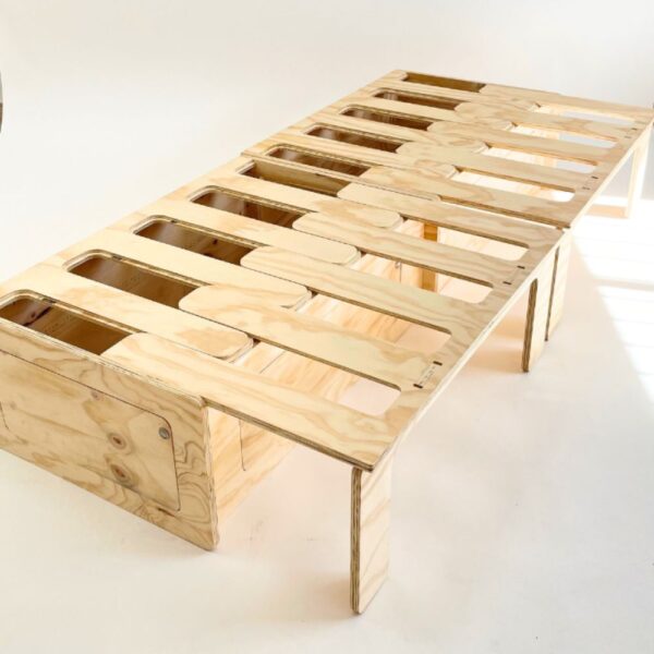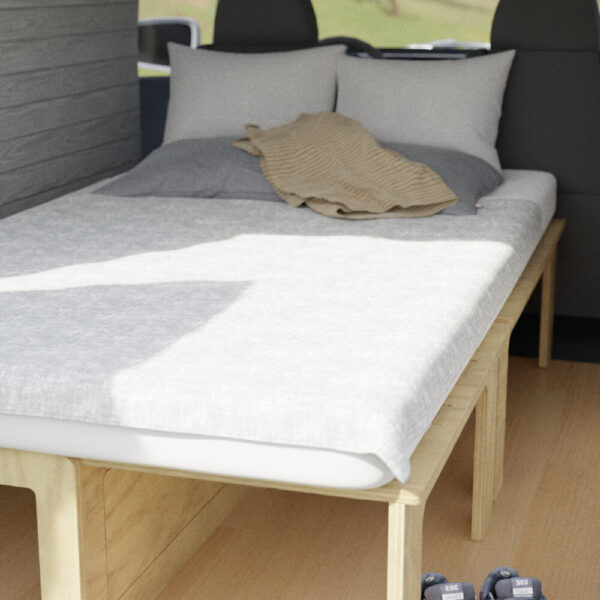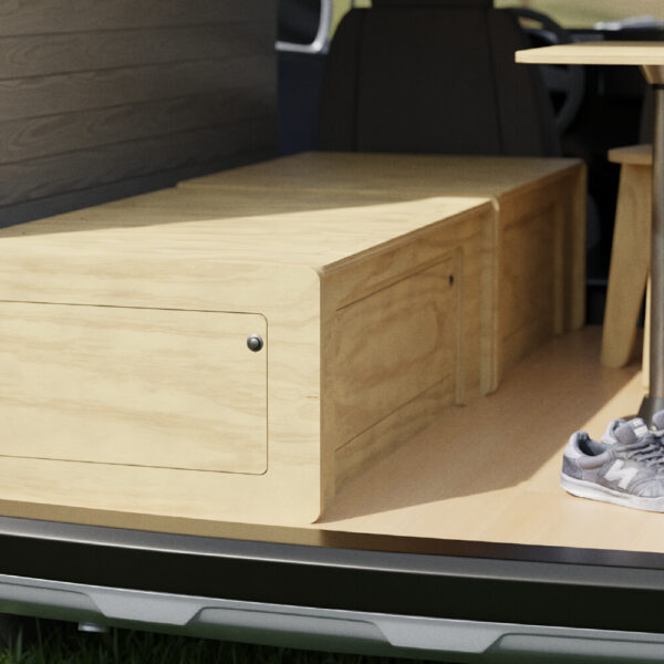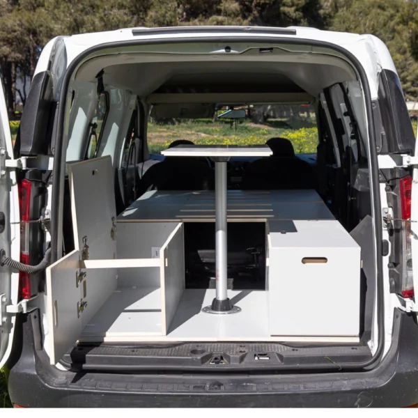Si quieres empezar en el mundo del camper este es tu kit ideal: Kit camper pirineos , compuesto de dos amplios baúles de gran de capacidad y una mesa con pata central perfecta para comer, leer y jugar dentro del vehículo. Desmonta la pata central y extiende el camper para poder disfrutar del descanso en una cama amplia. La cama cuenta con dos patas de madera para hacer el apoyo mucho más seguro y dar estabilidad a la cama.