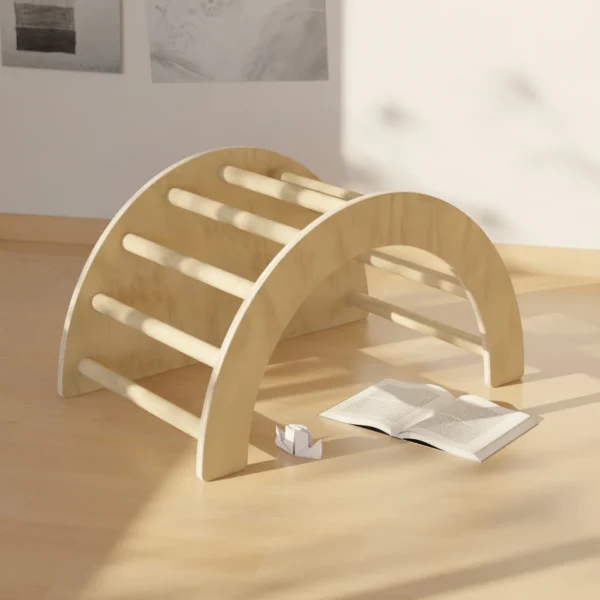 - Plataforma para trepar: Con su forma curva y su estructura sólida, el arco Montessori es ideal para que los niños trepen y exploren. Pueden escalar por encima de él, colgarse de los lados. Esta actividad no solo promueve el desarrollo físico al fortalecer los músculos y mejorar el equilibrio, sino que también fomenta la confianza y la autoestima de los niños al desafiarse a sí mismos y superar obstáculos de manera segura.