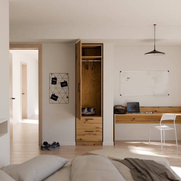 Los armarios a medida son quizá el mejor ejemplo de esto. Un armario como Nidus, configurable en baldas, cajones, barra para colgar o incluso combinando todo, permite organizar la ropa y los objetos de forma lógica. Cuando cada cosa tiene su sitio, el día a día se simplifica y el espacio se siente más ligero.