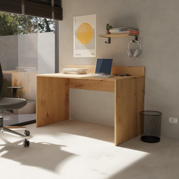Por ejemplo, un escritorio como Fátima, con su diseño pensado para mantener los objetos en su sitio, es especialmente útil si trabajas con papeles, libros o dispositivos y no quieres estar recolocándolo todo constantemente.