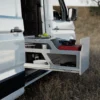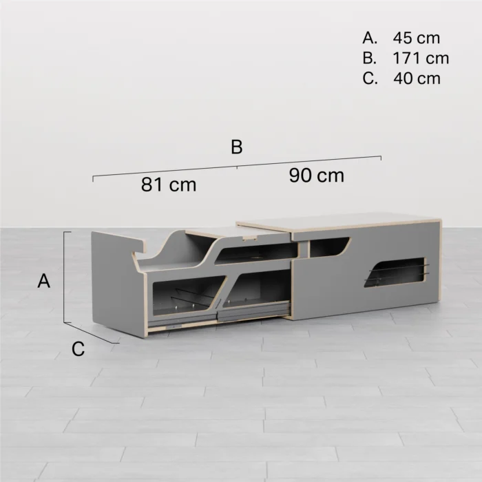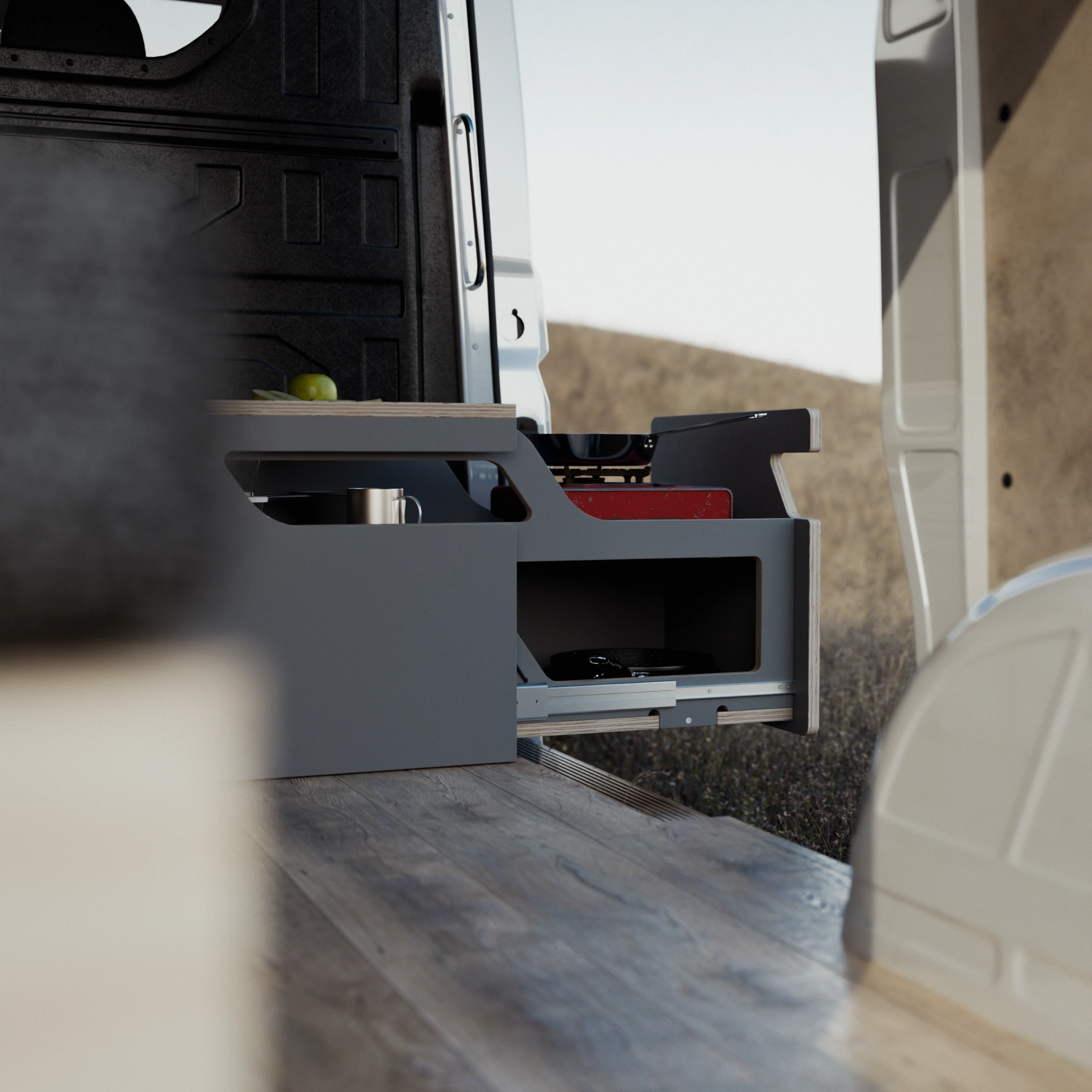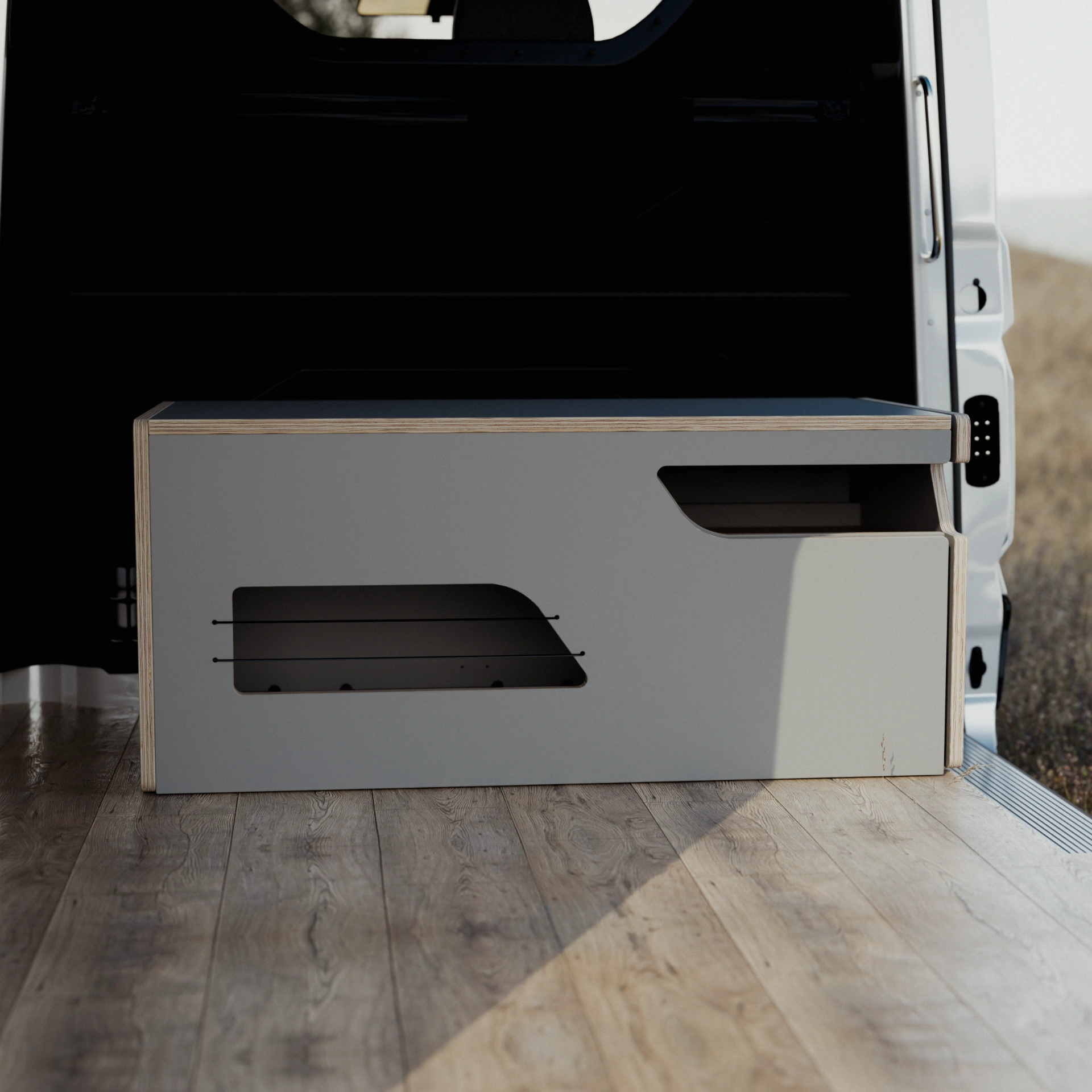 Fabricado en madera contrachapada de chopo con CPL gris, este arcón-cocina está diseñado para resistir las demandas del estilo de vida en la carretera, asegurando no solo funcionalidad sino también durabilidad en cada viaje.