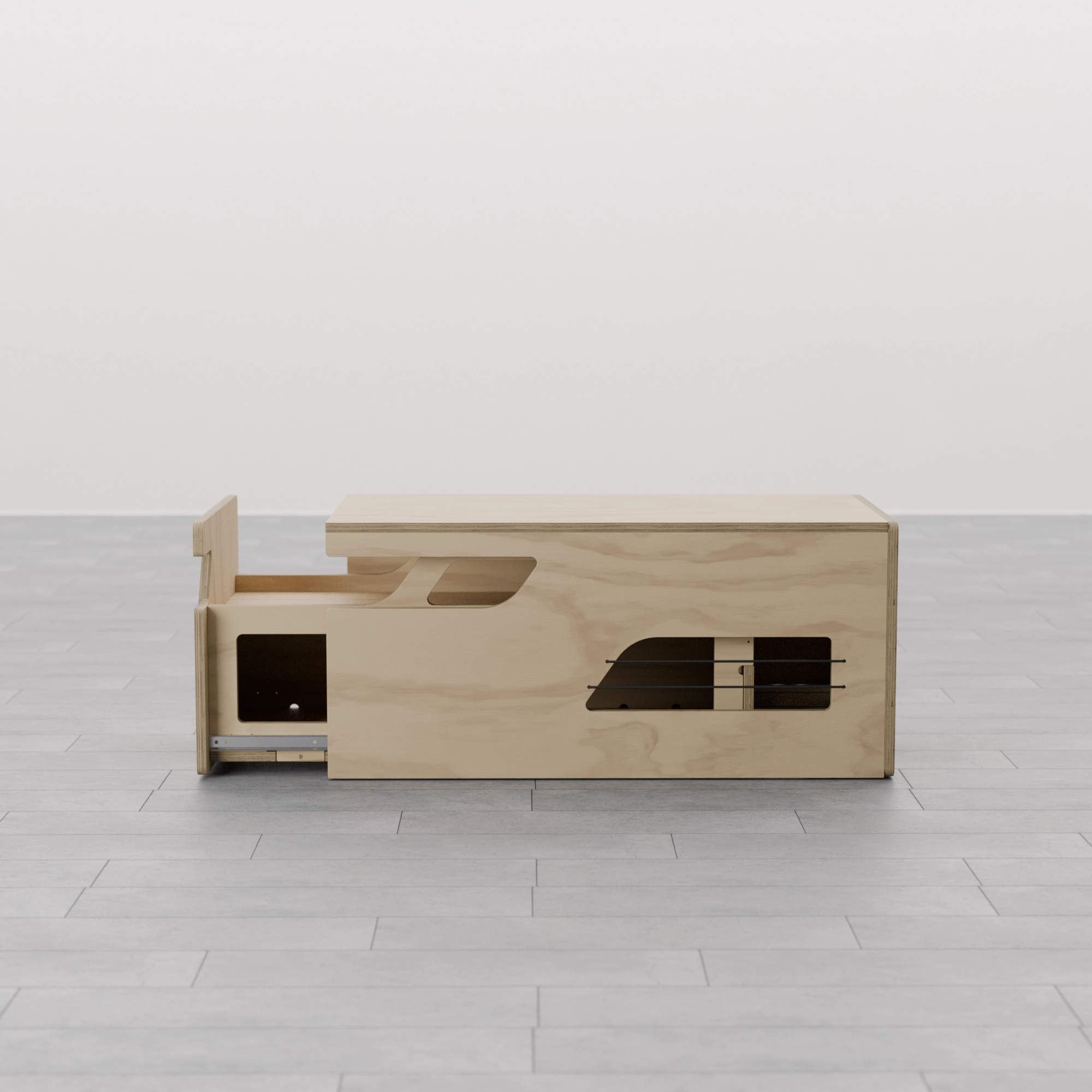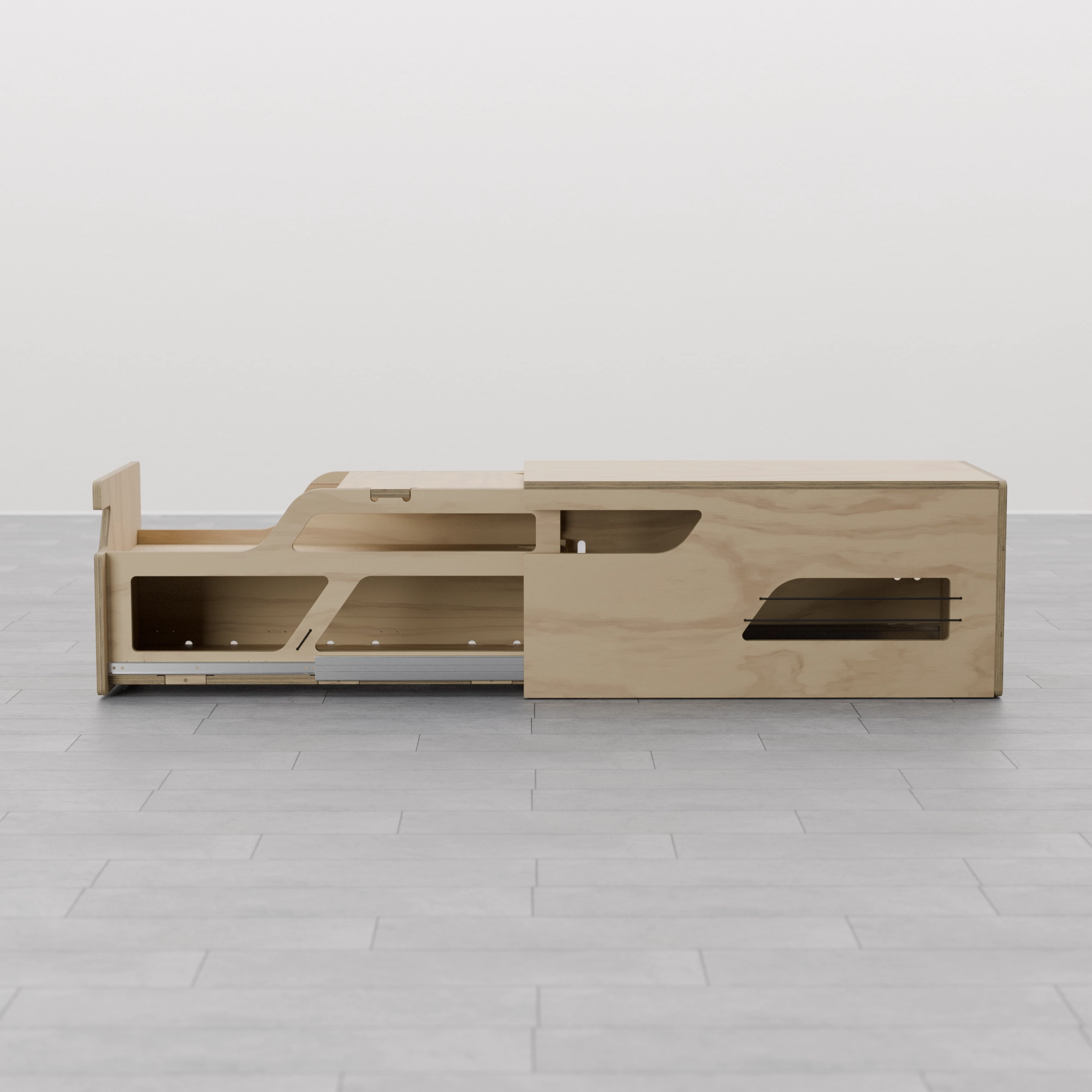 Fabricado en madera contrachapada de chopo con CPL gris, este arcón-cocina está diseñado para resistir las demandas del estilo de vida en la carretera, asegurando no solo funcionalidad sino también durabilidad en cada viaje.