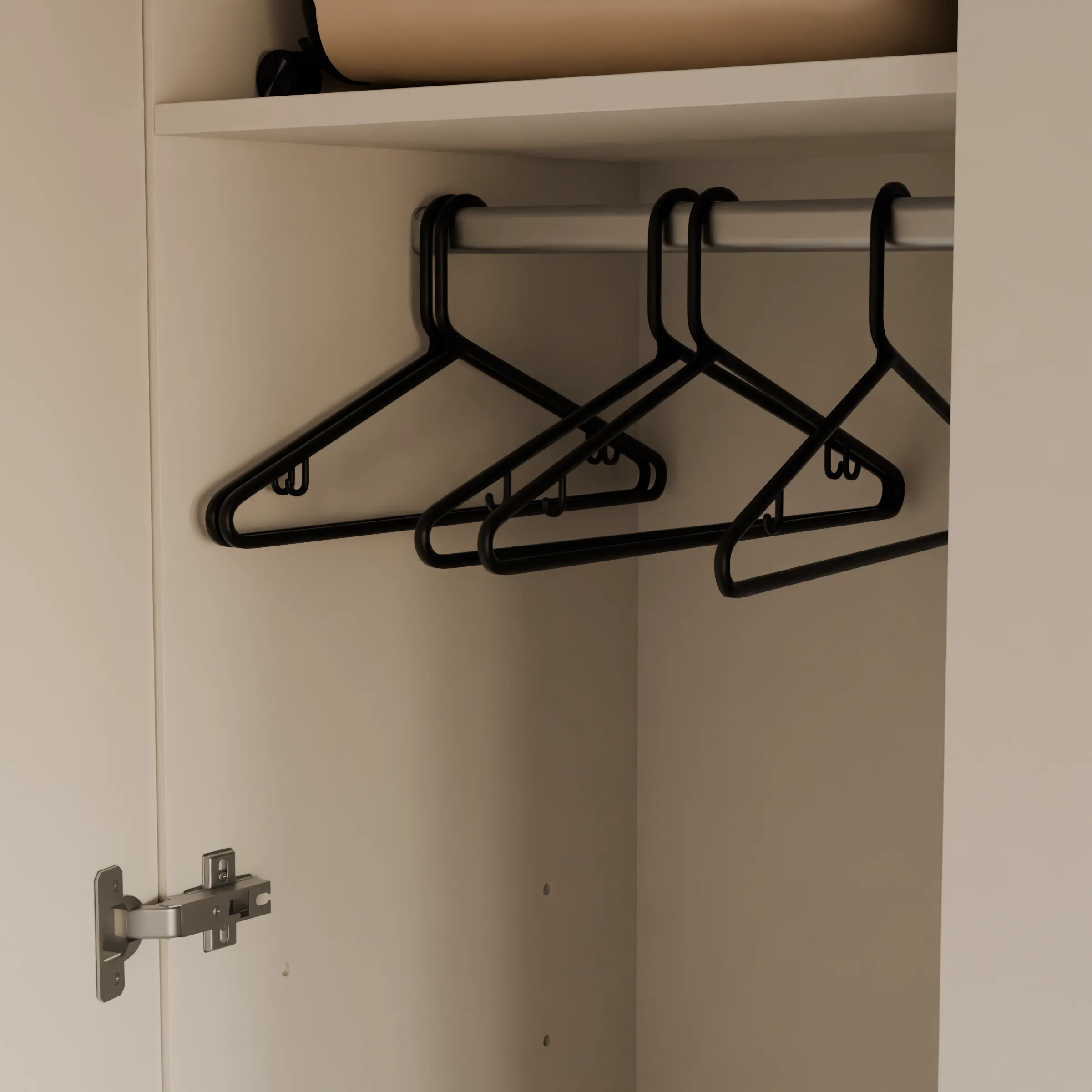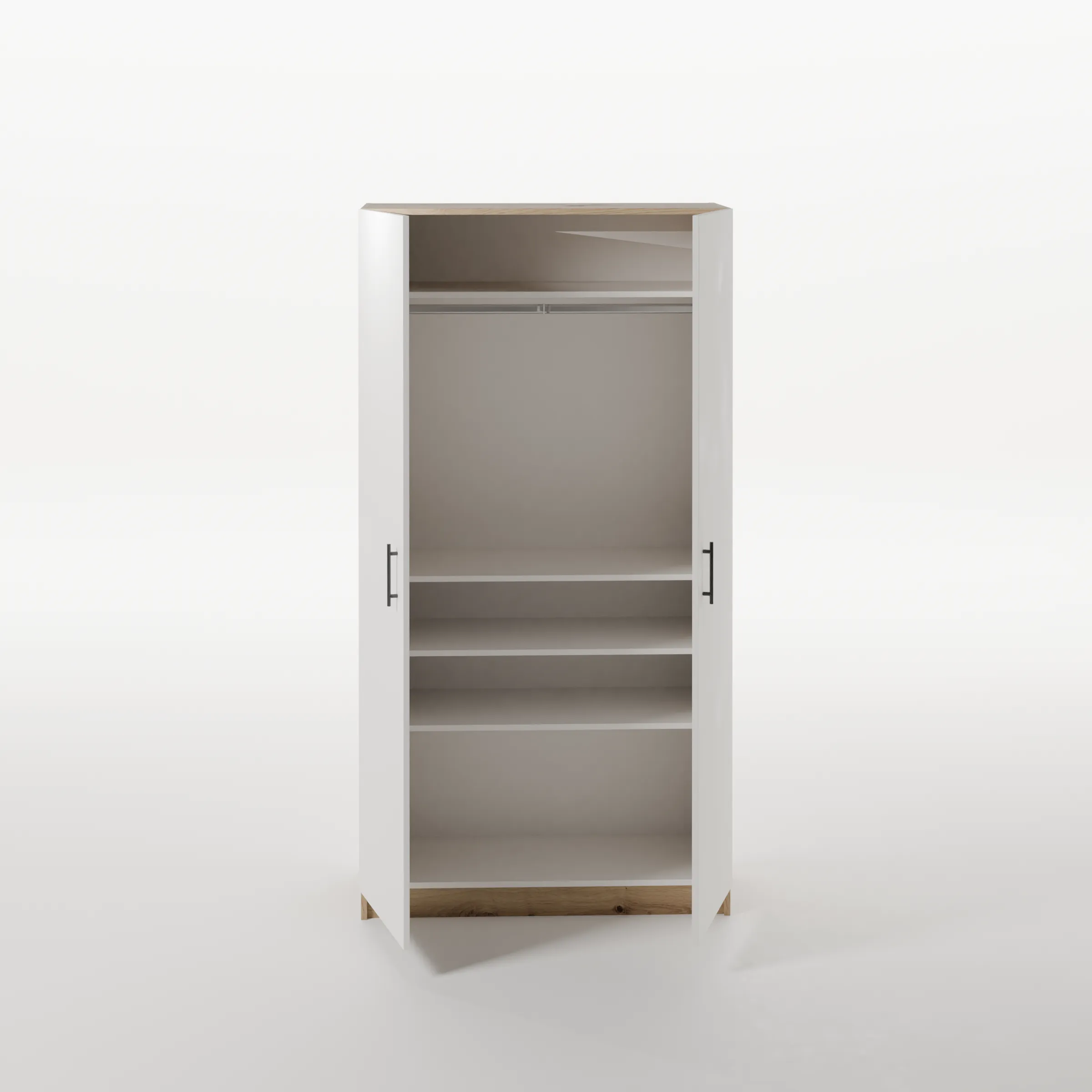 El armario de melamina con baldas está diseñado para quienes buscan orden y máxima organización en su hogar. Fabricado con tablero de melamina de 19 mm y trasera de 10 mm, integra un maletero superior, barra para perchas y puertas abatibles (dobles o simple).