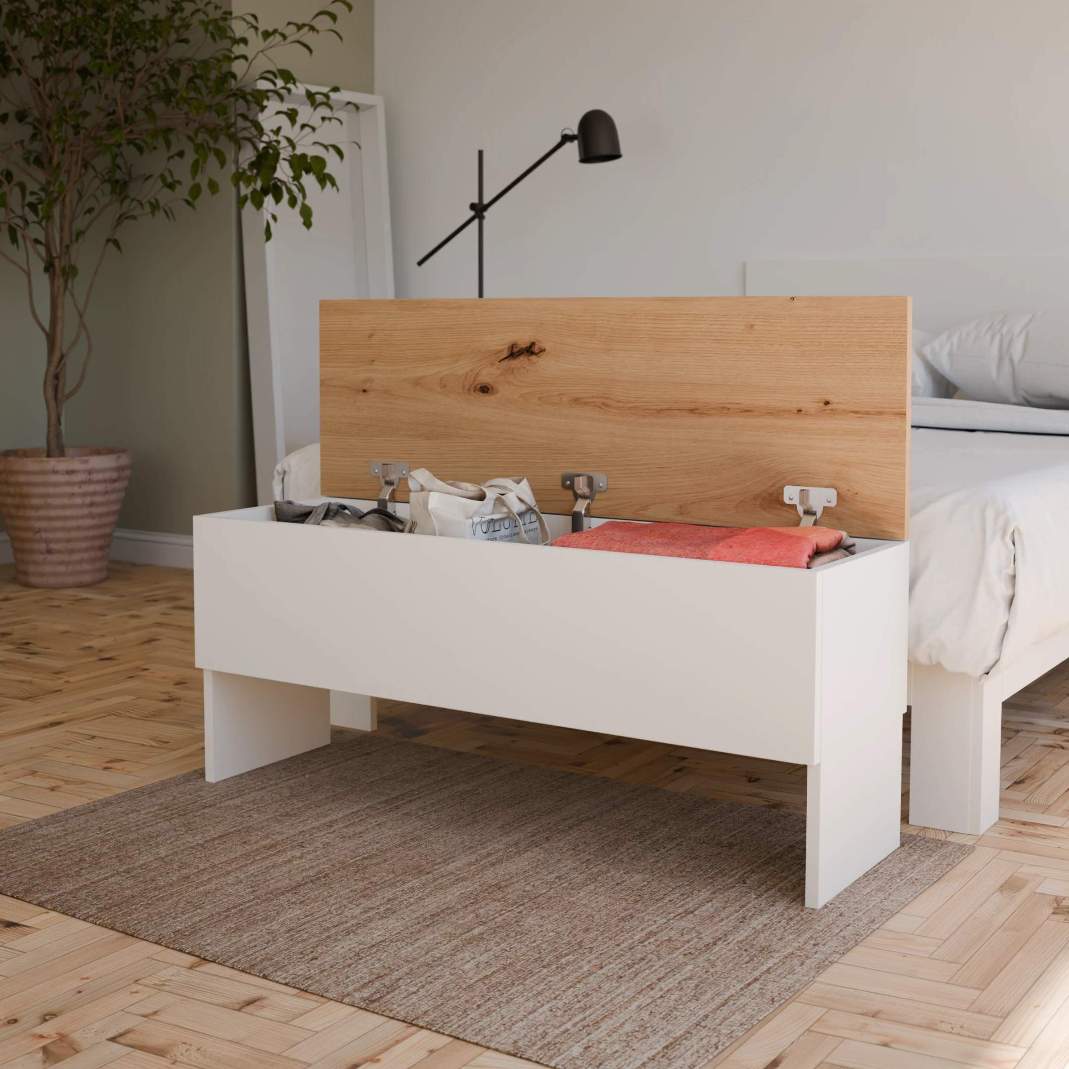 El banco arcón de madera combinado es la solución perfecta para quienes buscan orden, funcionalidad y estilo en un solo mueble. Su diseño moderno y práctico combina la belleza natural del acabado roble con colores actuales como blanco, gris, antracita o nude, creando una pieza versátil que se adapta a cualquier tipo de decoración, desde ambientes nórdicos y modernos hasta rústicos o minimalistas.