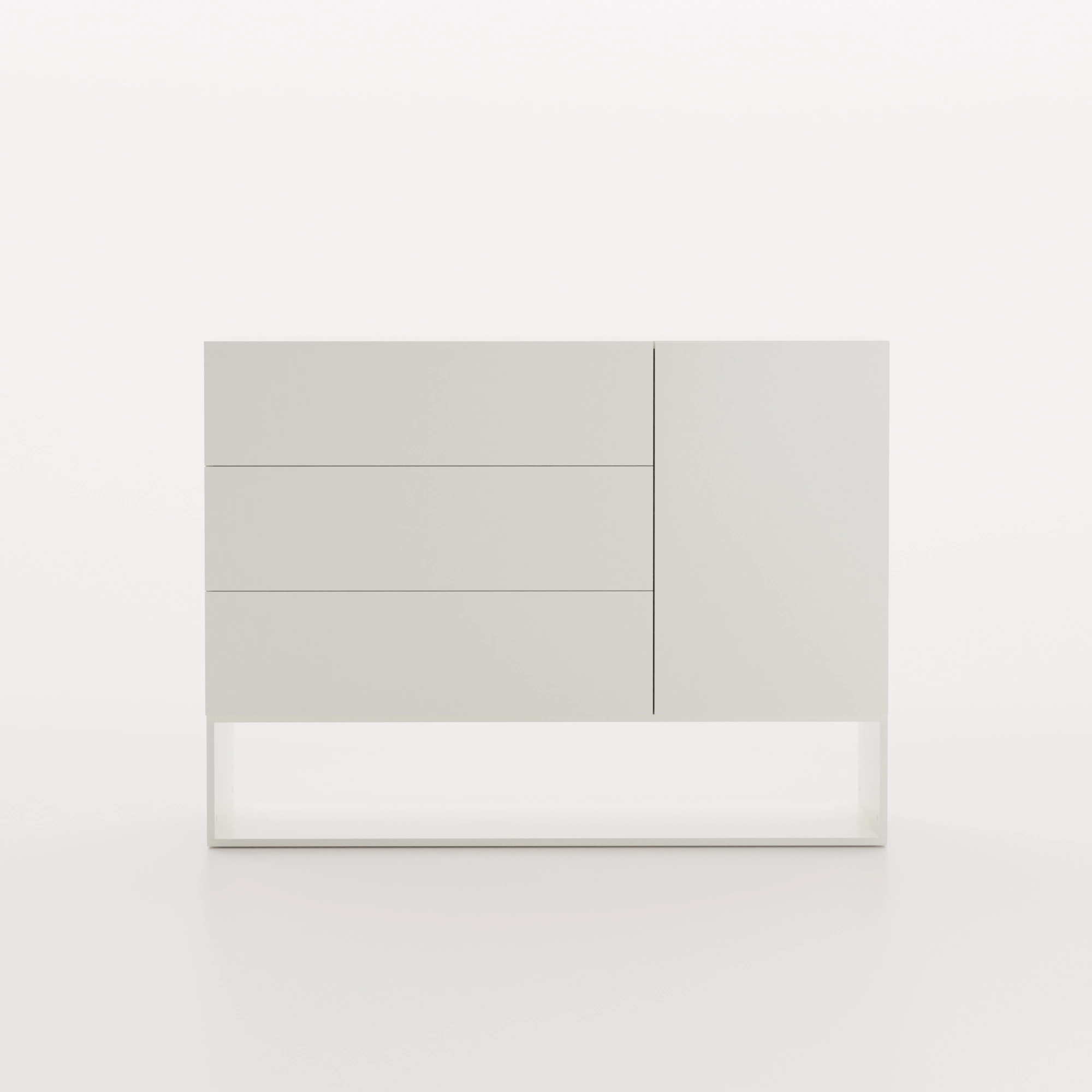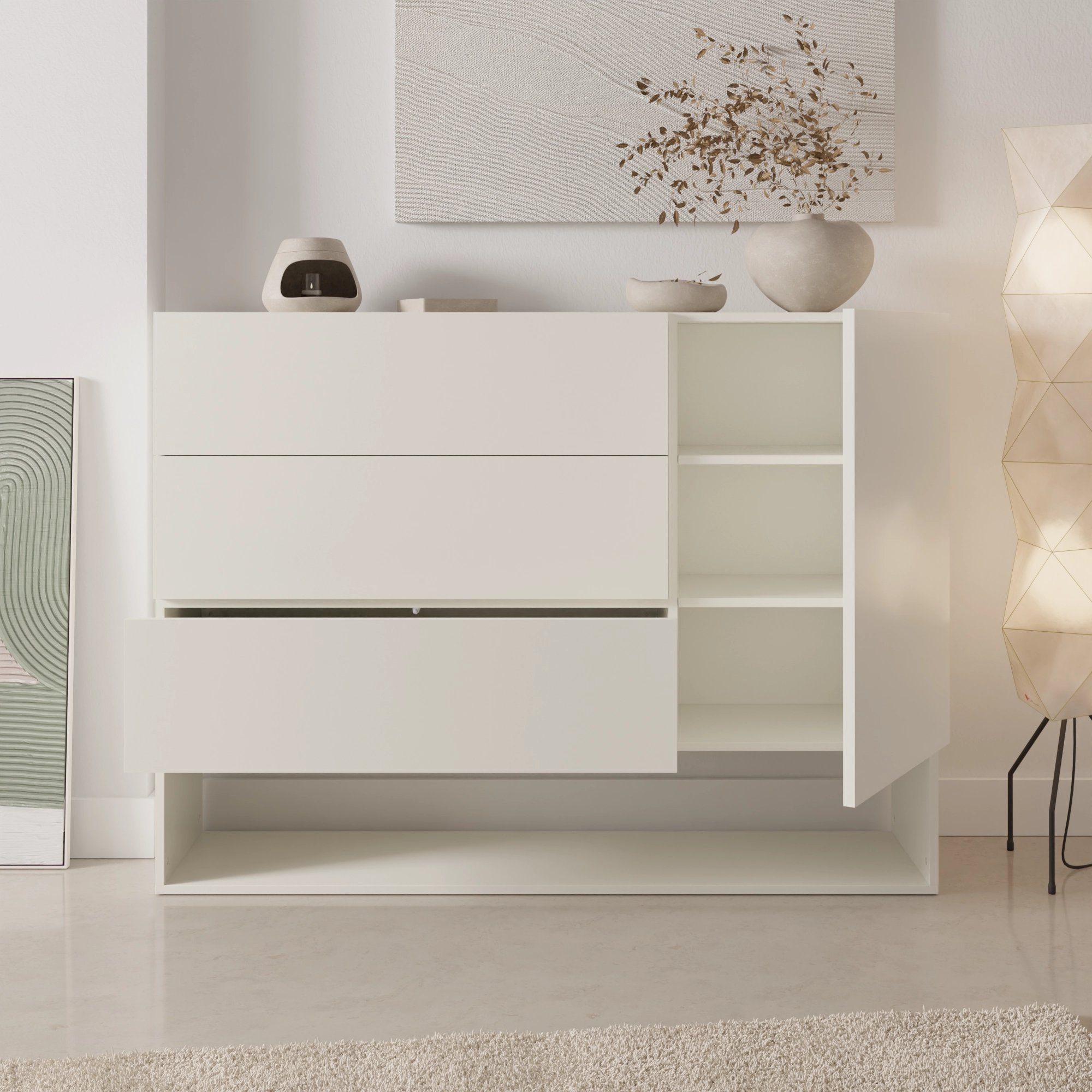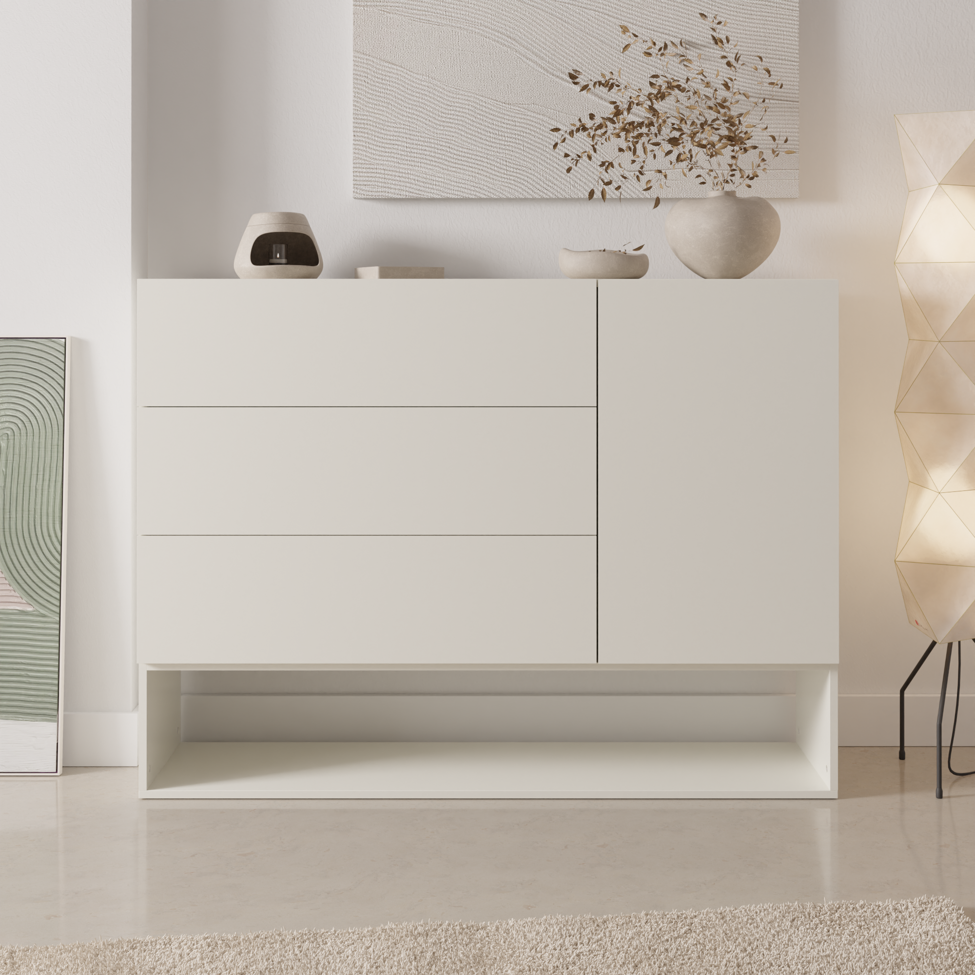 Uno de los aspectos más destacados de la cajonera Camille es su sistema de apertura push. Esta tecnología permite abrir los cajones con un simple toque, eliminando tiradores visibles y reforzando su línea estética minimalista. Además, su elegante hueco inferior abierto añade ligereza visual al mueble, dándole un toque distintivo y moderno.