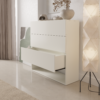 Uno de los aspectos más destacados de la cajonera Camille es su sistema de apertura push. Esta tecnología permite abrir los cajones con un simple toque, eliminando tiradores visibles y reforzando su línea estética minimalista. Además, su elegante hueco inferior abierto añade ligereza visual al mueble, dándole un toque distintivo y moderno.