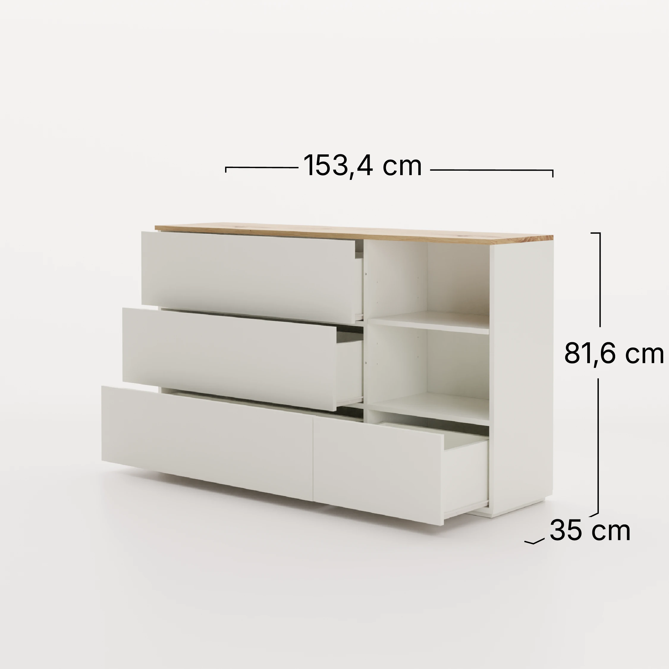 Gracias a su gran capacidad interior, podrás guardar ropa, textiles, documentos o cualquier tipo de objeto personal, manteniendo todo en orden y al alcance de la mano. La cómoda Luc no solo es funcional, sino que también se convierte en un elemento decorativo que aporta armonía, luz y estilo a cualquier estancia.
