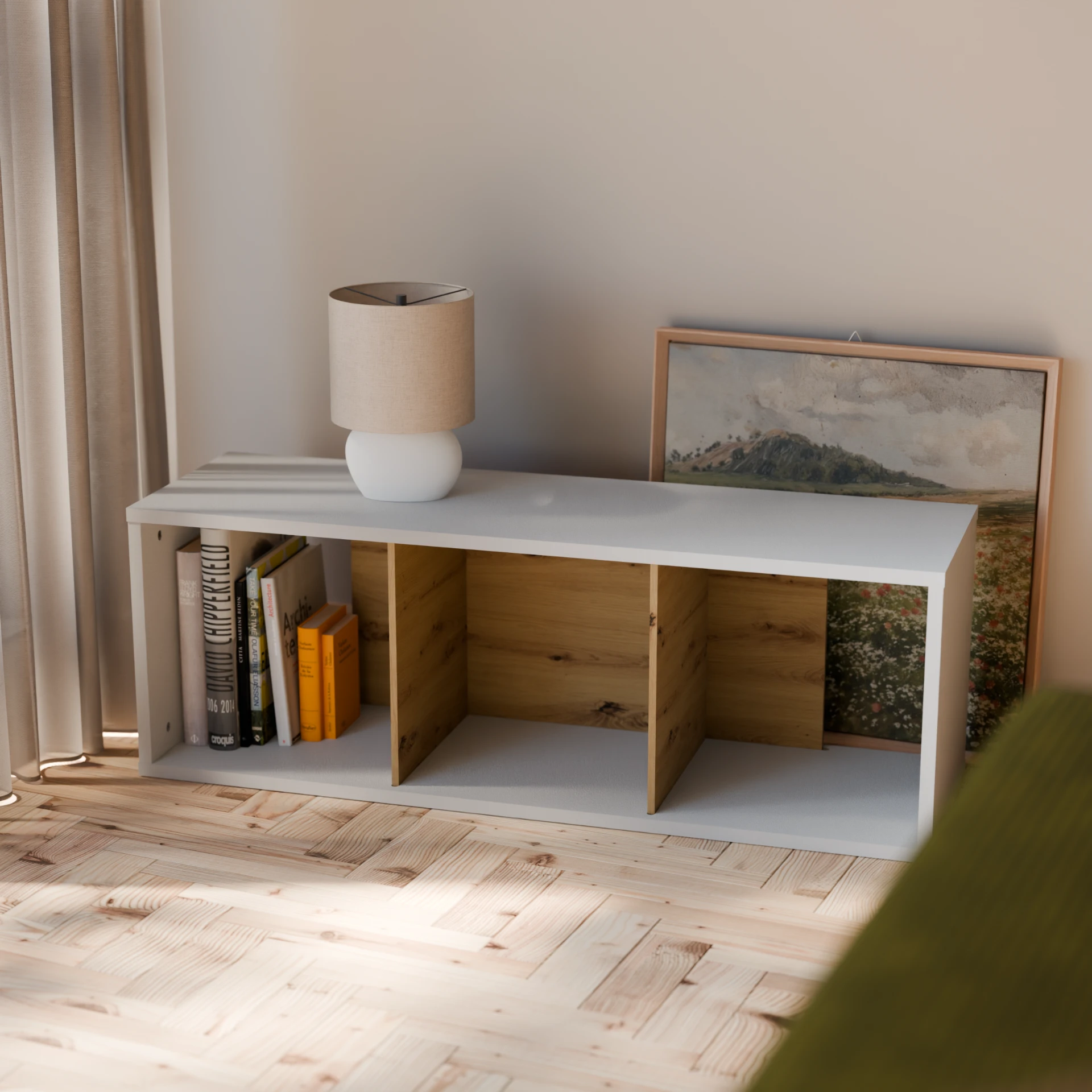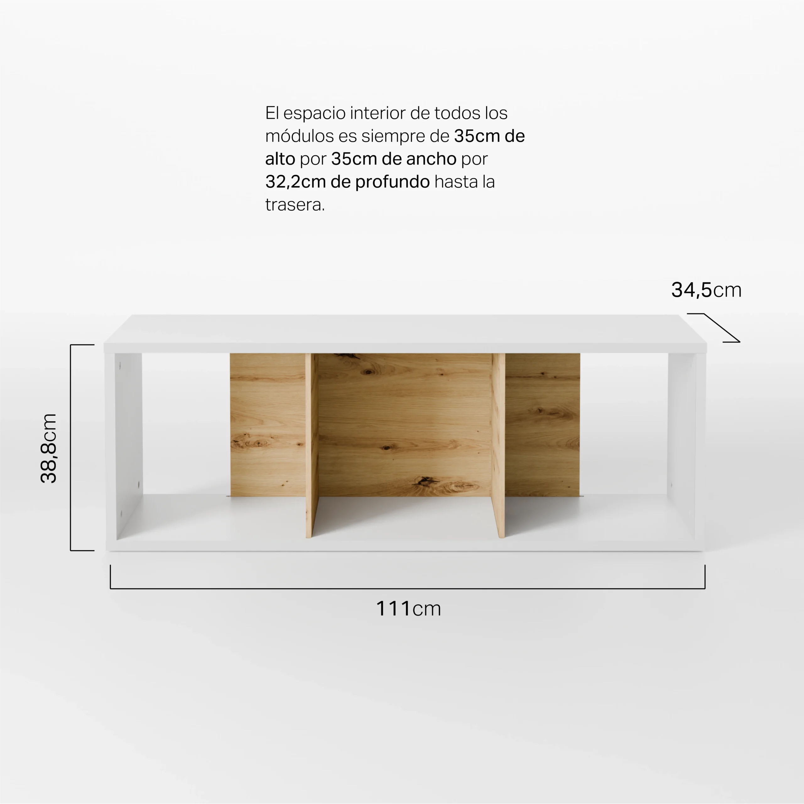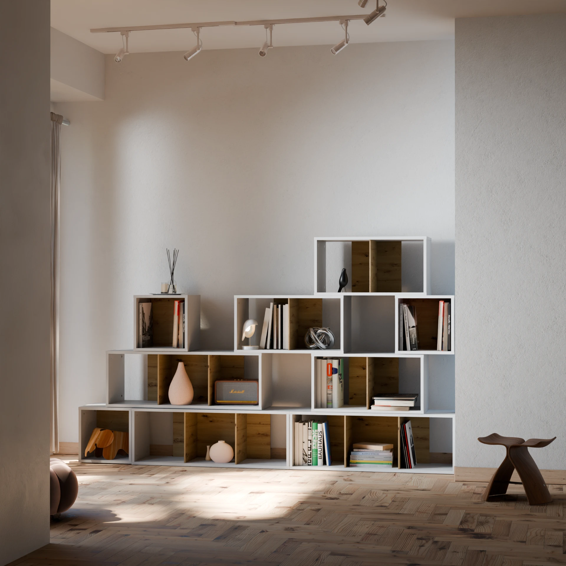 Fitxa es una estantería modular con 3 compartimentos, diseñada para colocarse en el suelo, en formato vertical u horizontal, según el espacio disponible. Cada cubo incorpora una trasera parcial, que aporta soporte sin cerrar completamente el fondo, manteniendo una estética ligera y abierta.