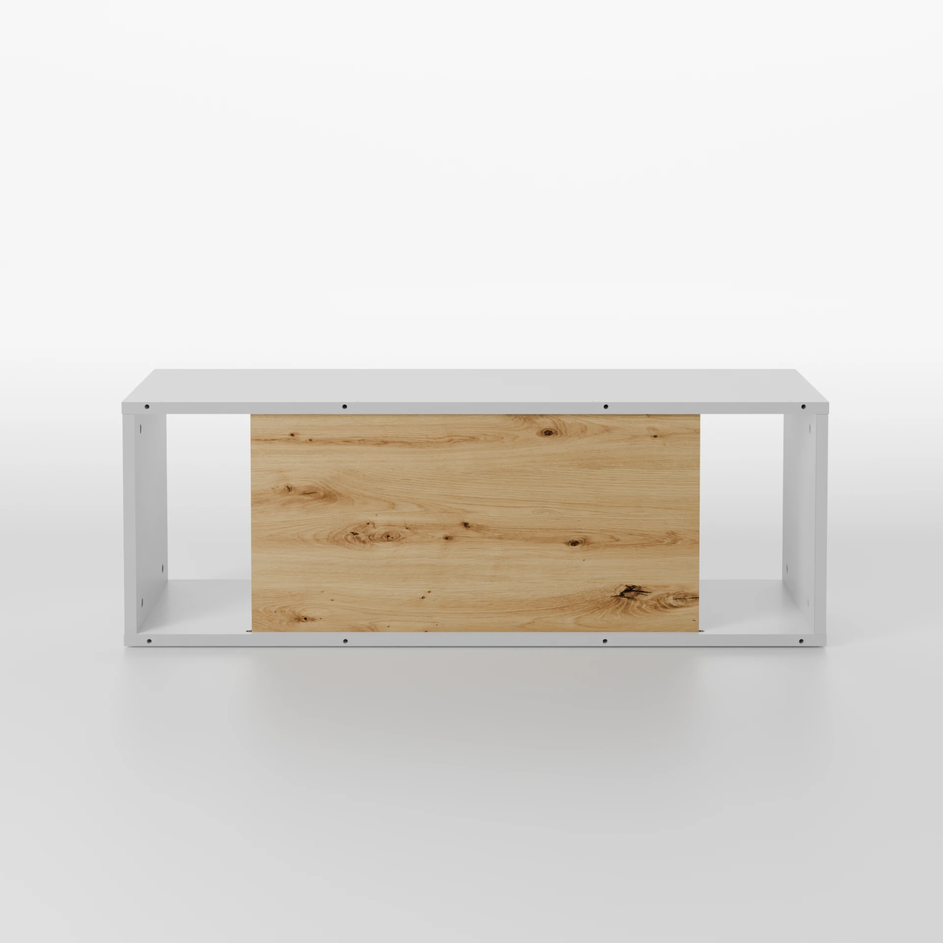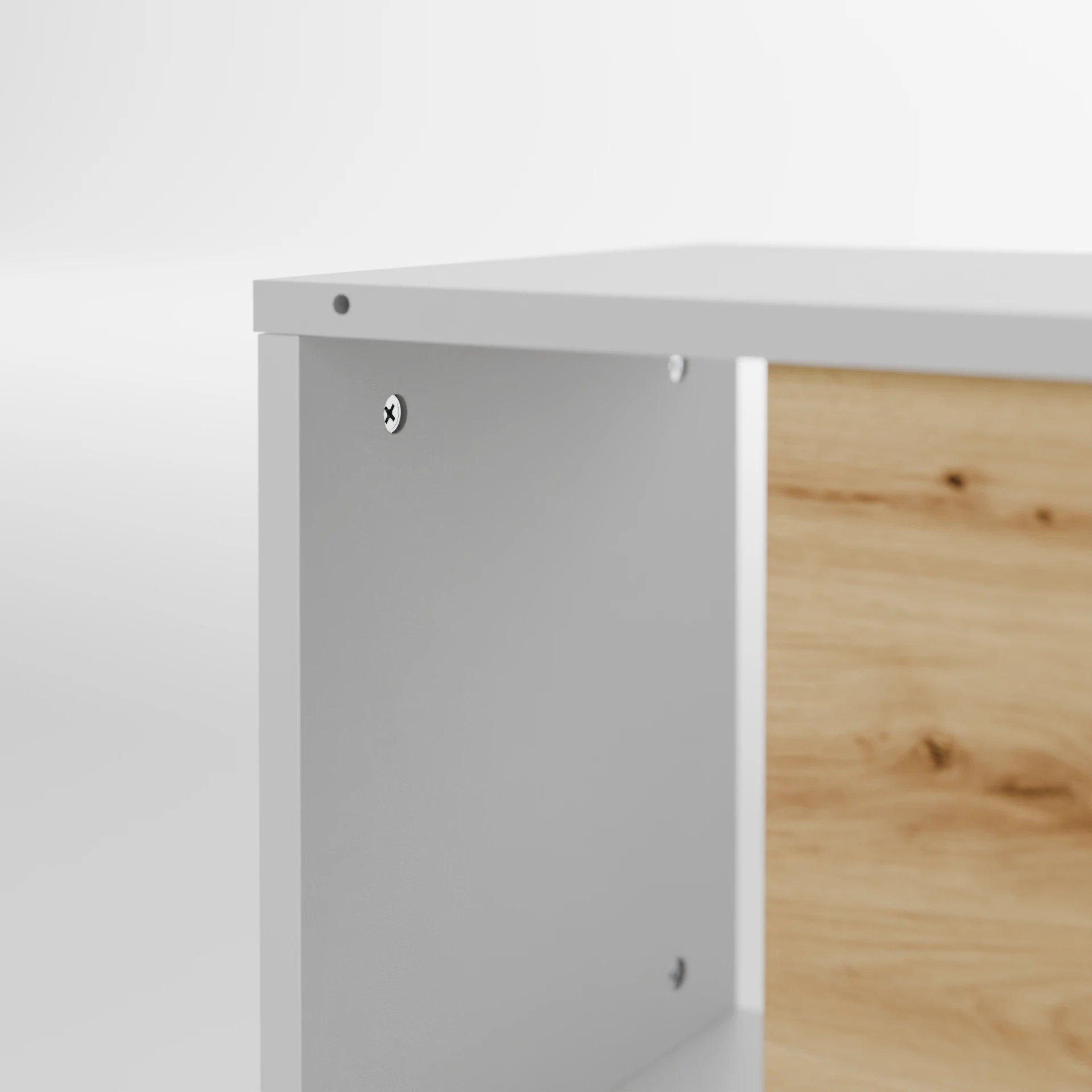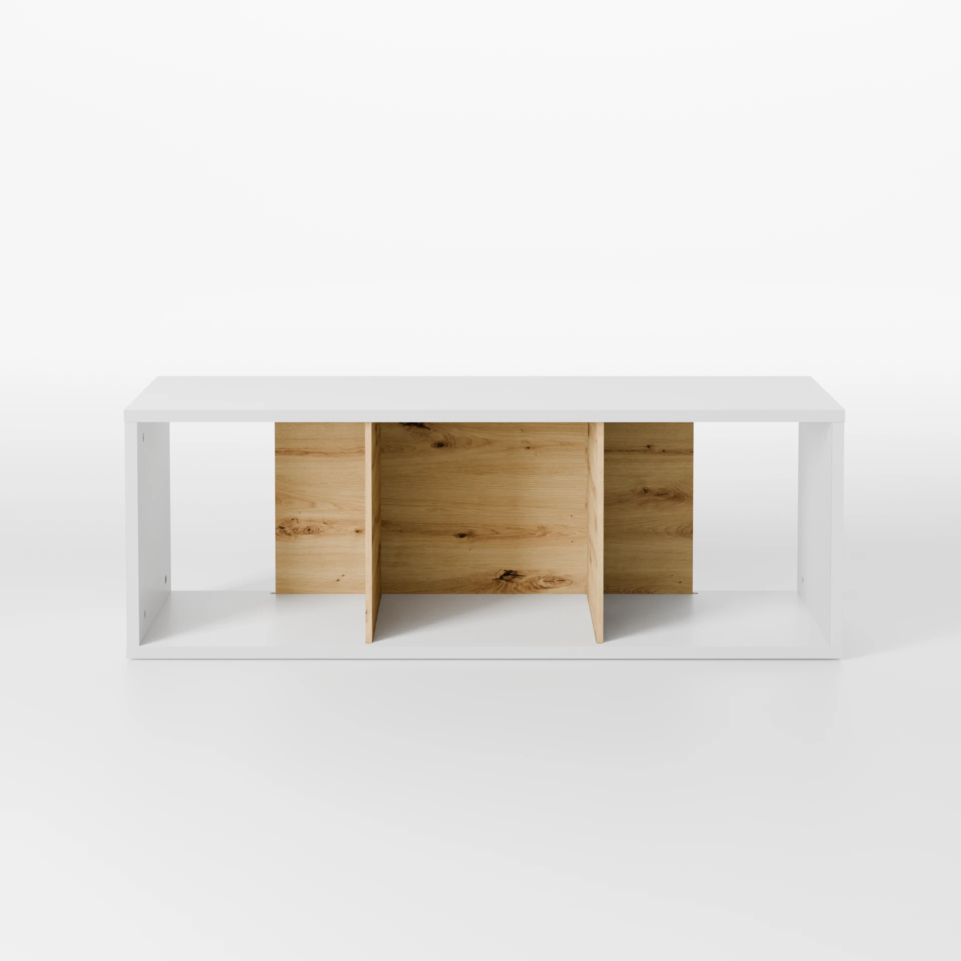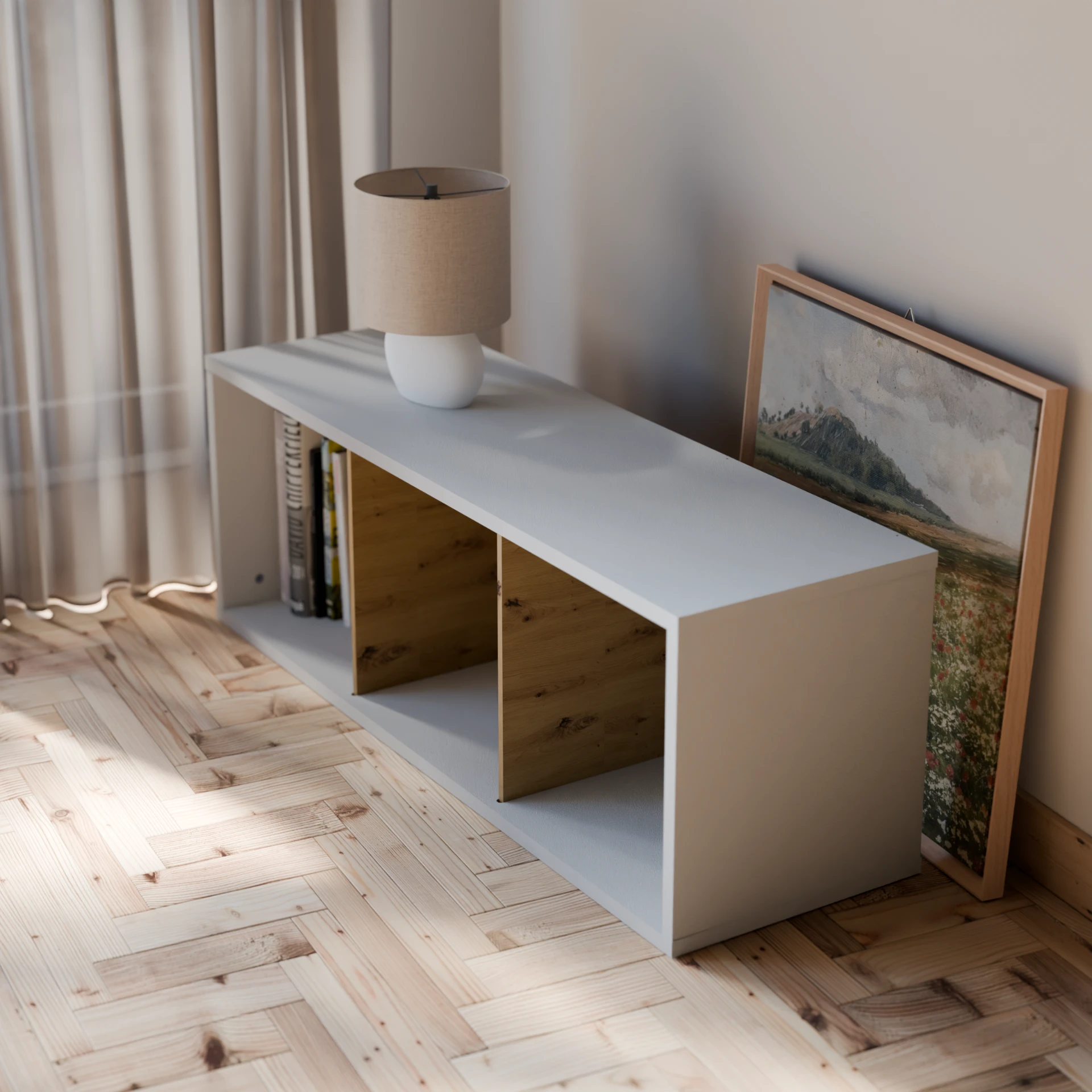 Fitxa es una estantería modular con 3 compartimentos, diseñada para colocarse en el suelo, en formato vertical u horizontal, según el espacio disponible. Cada cubo incorpora una trasera parcial, que aporta soporte sin cerrar completamente el fondo, manteniendo una estética ligera y abierta.